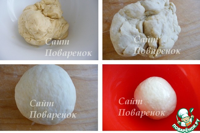 Тесто из чаши миксера переложить на рабочую поверность, немного промесить. Тесто должно быть довольно плотное, но не забитое мукой. Соберать тесто в шар. Чистую миску смазать растительным маслом, поместить в нее тесто, накрыть пленкой (полотенцем, крышкой), убрать в теплое место на 30-40мин.