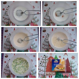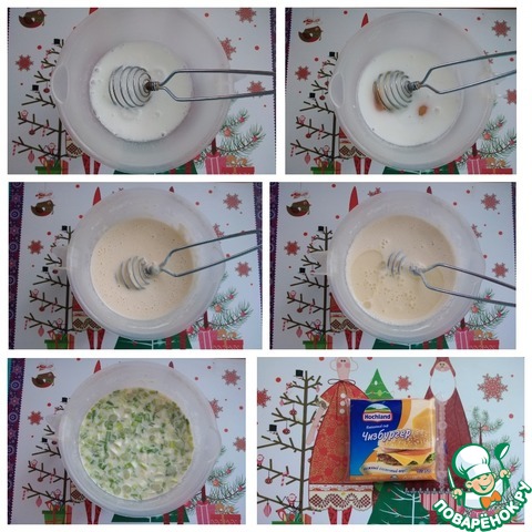 Делаем тесто. Я взяла прокисшее молоко. Можно взять обычное. Налила в посуду, где буду делать тесто, положила разрыхлитель и дождалась реакции - появится пенка. Добавила сахар, разбила яйца, венчиком всё соединила. По ложке вмешала венчиком муку. Постоянно помешивая, влила крутой кипяток в тесто. Положила соль и налила подсолнечное масло. Масло в тесте нужно для того, чтобы не подмазывать каждый раз сковороду для выпечки блинов. Порезала мелко зелёный лук. Лука не жалейте, с ним очень вкусные блины получаются. Отправила в тесто, перемешала. Тесто к выпечке готово. Ещё припёком у меня будет сыр Hochland "Чизбургер" в порционных кусочках.