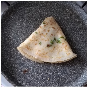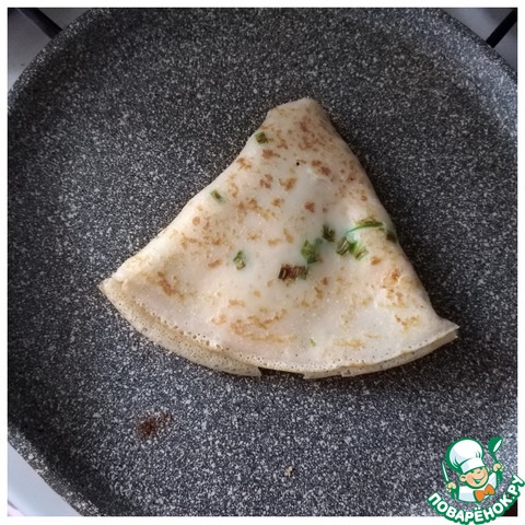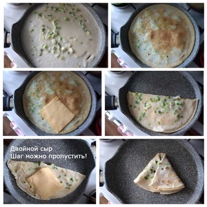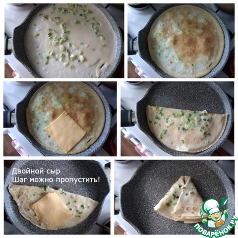 Выпекаем блины. У меня сковорода антипригарная D-24 см. Греем сковороду хорошо. Поварёшкой наливаем тесто, предварительно мешая его, чтобы лук зелёный не осел на дно, а распределился ровно по тесту. Наливаем тесто тонким слоем. Блины будут очень тонкие. Когда блин схватится с одной стороны (проверяем лопаточкой по краю), переворачиваем и немного даём зажариться другой стороне. На одну половину блина выкладываем ломтик сыра по центру (см. фото). Перегибаем блин пополам, обжариваем половину с одной стороны, опять переворачиваем и обжариваем другую половину. Подворачиваем оба края, формируя треугольник (см. фото). Красиво подрумяниваем и снимаем на тарелку. Это блины с одним ломтиком сыра. Если вы захотите положить второй ломтик сыра, то его выкладывайте, когда перегнёте блин пополам и обжарите с обеих сторон половинки (см. фото, я его подписала!). Двойной сыр - для любителей обильной сырной начинки.