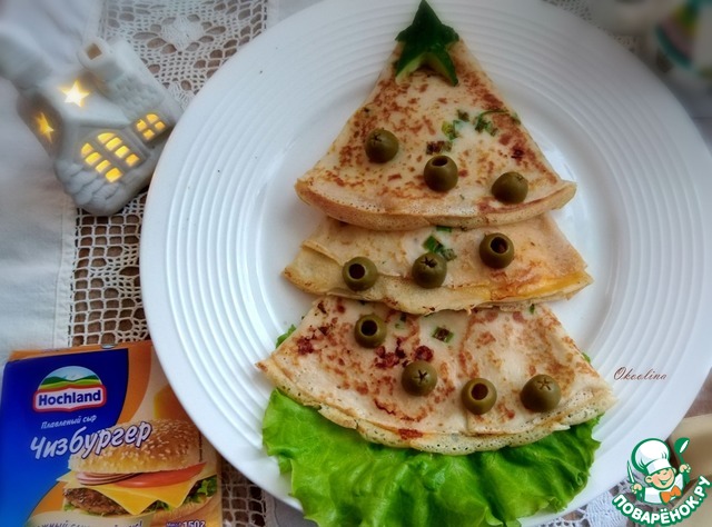 Тонкие блины на кислом молоке с припёком из зелёного лука и сыра плавленного "Чизбургер" Hochland. Блины подам с новогодним настроением. Выложу их "ёлочкой" и украшу. Блины с припёком из любого лука, будь он зелёный или просто натёртый на тёрке репчатый, сами по себе очень вкусные. С сыром - просто отличное сочетание. Не обязательно их выкладывать "ёлочкой", можно подать просто так.