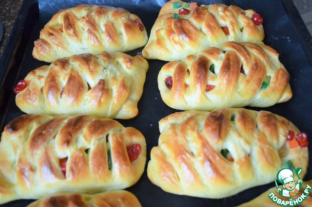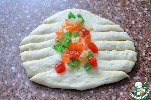 • Колобок расплющить в круг, 12 - 14 см., слегка вытянуть верх. На середину выложить 1 ст. л. смеси цукатов. Сделать разрезы по бокам.