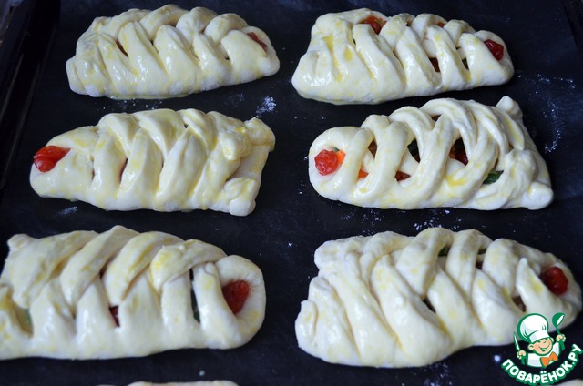 • Расстоявшиеся заготовки смазать смесью желтка и сливок.