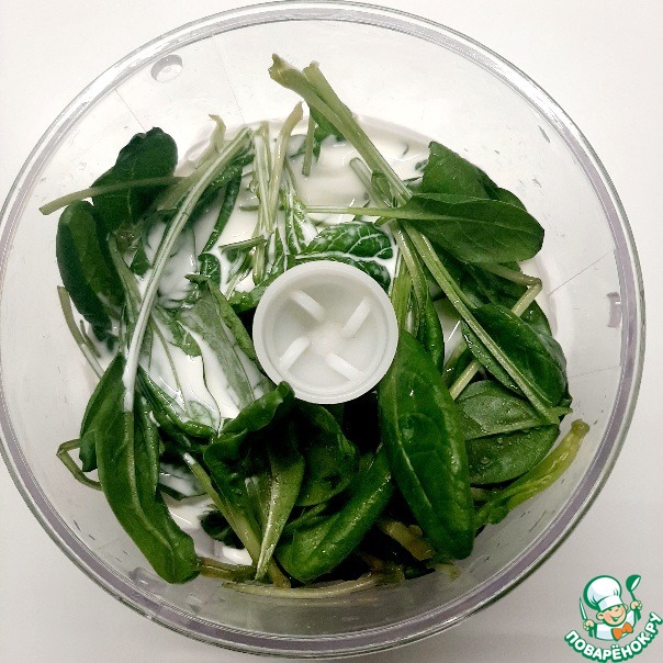 Промытый и обсушенный шпинат залить сливками и измельчить в блендере.