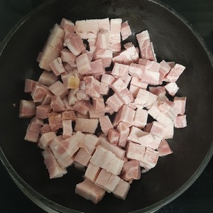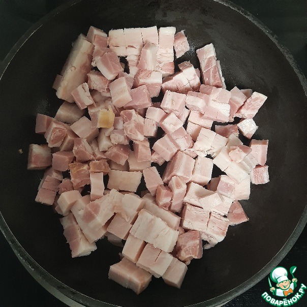 Бекон или грудинку порезать мелким кубиком и обжарить на сухой сковороде.