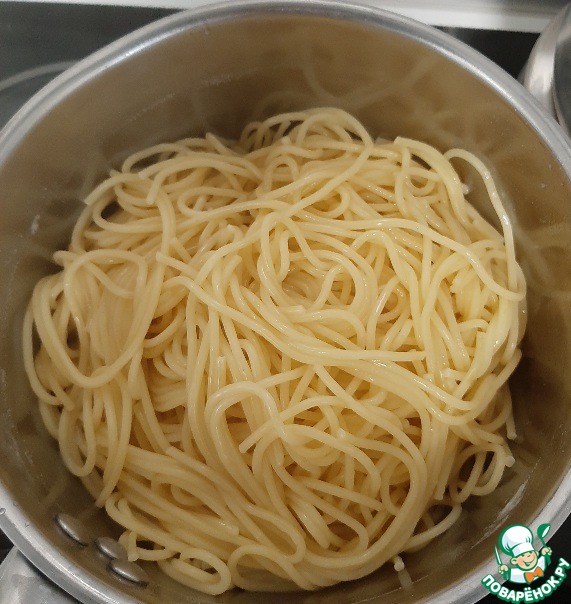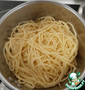 Макаронные изделия отварить в подсоленной воде, откинуть на дуршлаг, вернуть в кастрюлю. Можно добавить ложку растительного масла, чтобы не склеились.