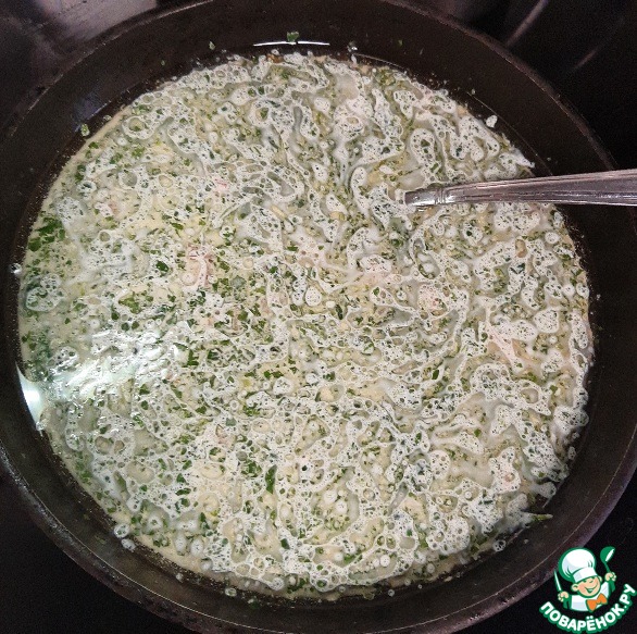 В поджареный бекон влить сливочную смесь и проварить до загустения несколько минут. Солить не надо.