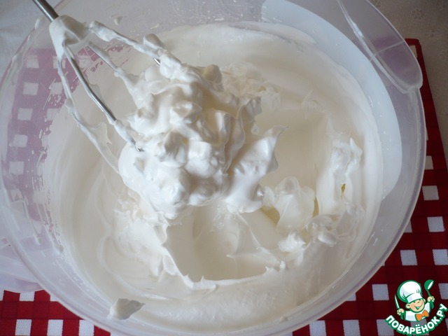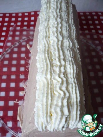 Теперь приготовим крем для отделки торта. Берем холодные сливки добавляем 3 ст. ложки сахарной пудры и все хорошо взбиваем до твердых пиков. Переложить крем в кондитерский мешок и выложить его на верхний слой торта (крыша домика).