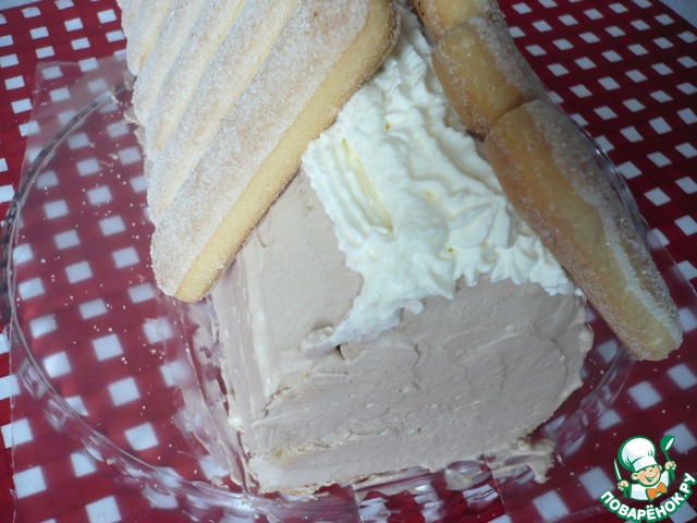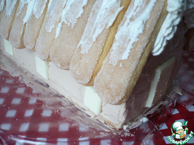 Затем закрепим печенье савоярди на крыше, хорошо придавливая его к сливочному крему.