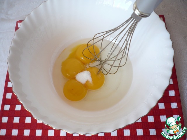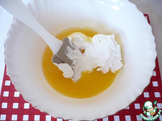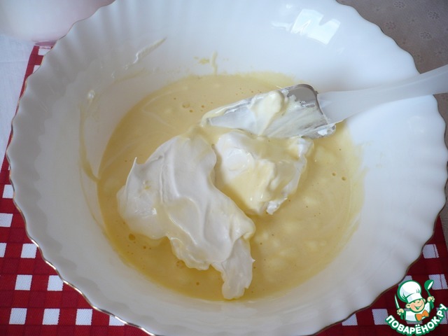 В миску с желтками добавляем небольшое количество взбитых белков и все аккуратно перемешиваем.