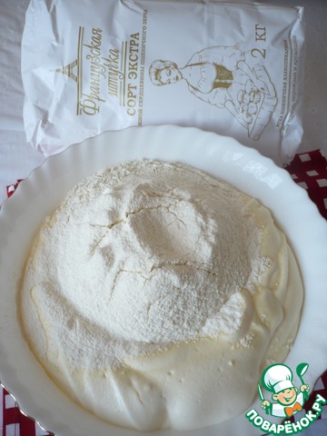 В белки с желтками добавьте разрыхлитель теста и просеянную пшеничную муку сорт "Экстра" - Французкая штучка. Все аккуратно перемешать.