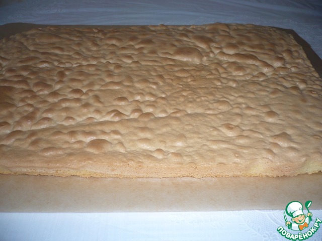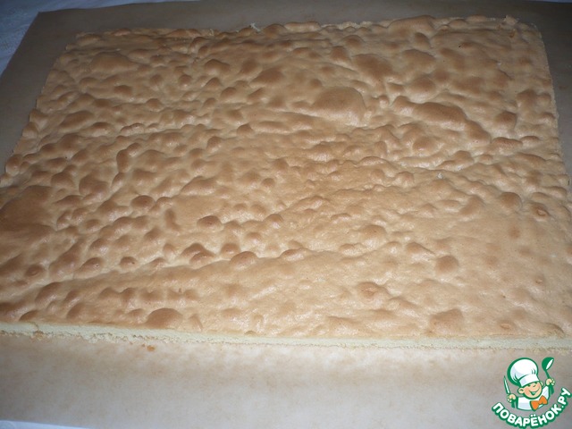 Противень ( размером 30 х 40 см) застилаем пергаментной бумагой и аккуратно выливаем тесто, распределяя по всей поверхности формы.