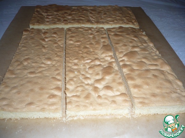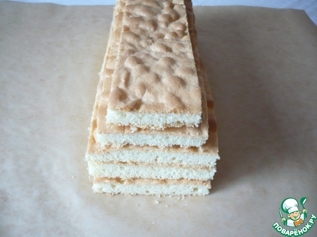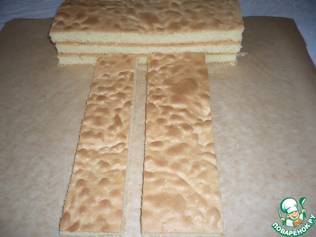 Выложить разрезанные коржи бисквита стопочкой - это будет "каркас" домика.