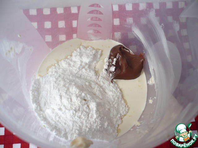 Приготовим крем для коржей. Взбиваем миксером в пышную массу: холодные сливки, сливочный сыр, сахарную пудру и нутеллу.