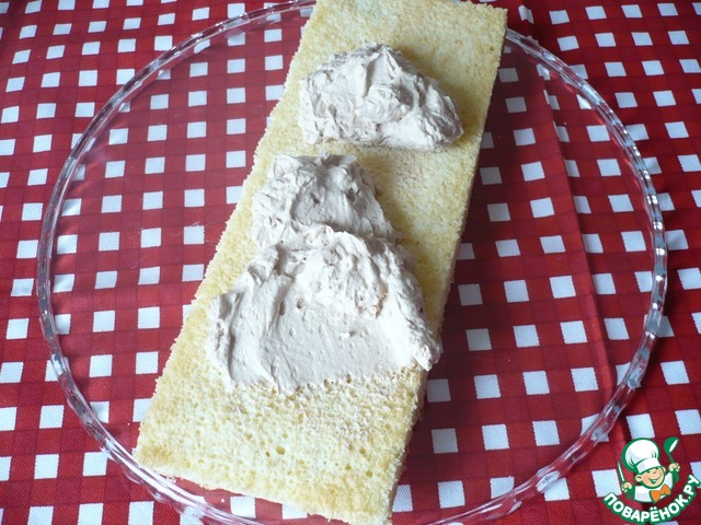 Начнем с прикрепления основания (коржа 10 х 25) к блюду: небольшим количеством крема смазать блюдо и уложить первый корж. Промазать его кремом.