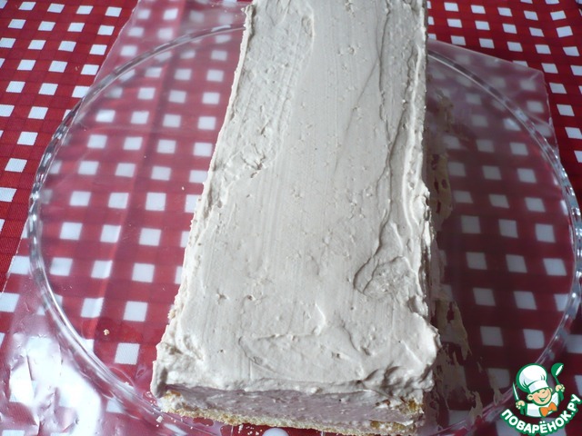 В таком порядке чередуем все коржи до последнего "прямоугольника" крыши: (бисквитный корж пропитанный молоком, затем промазываем кремом). Верх и бока обмазать оставшимся кремом.