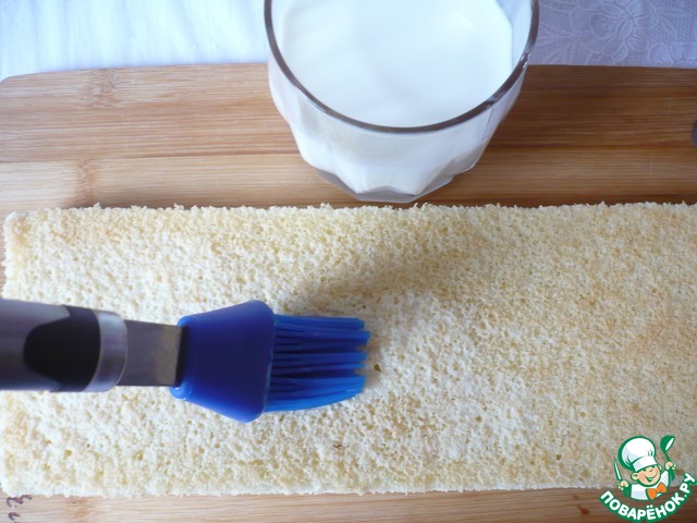 Затем наливаем в чашку холодное молоко и аккуратно кисточкой пропитываем все коржи.