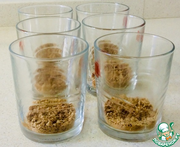 Выложить печенье нижним слоем и полить кофе. У меня вышло примерно 2ст. л. печенья и 2ч. л. кофе на порцию. Лучше выкладывать слои единовременно и по ходу действия нивелировать