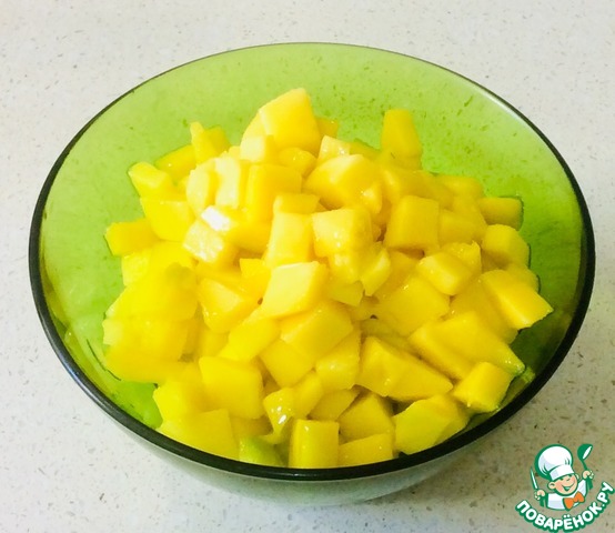 Нарезать манго мелкими кубиками, приблизительно 1см х 1см