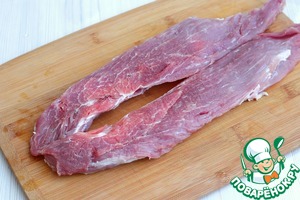 Свиную вырезку подготовить для запекания. Для этого: зачистить от лишнего жира, удалить пленочки, разрезать вдоль на две части.