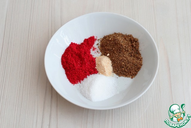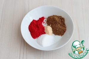 Подготовить специи для маринования мяса. В миску добавить соль (по вкусу), добавить сладкую паприку, добавить готовую смесь для жарки мяса, в состав которой входят: кориандр, лук, мускатный орех, паприка, перец черный, кумин, майоран, чеснок, перец красный, базилик, чабер.