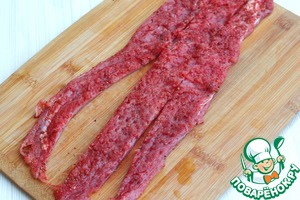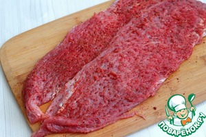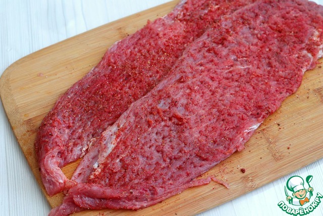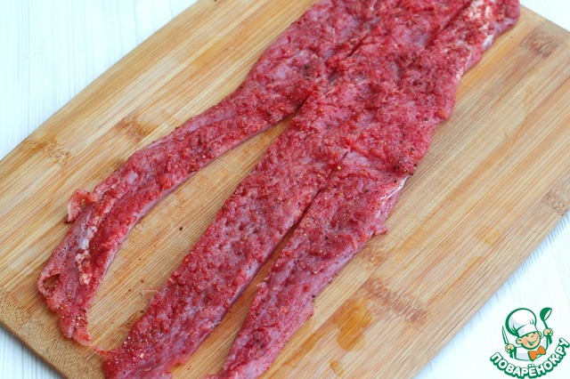 Полоски вырезки натереть с двух сторон подготовленной пряной смесью.
