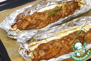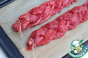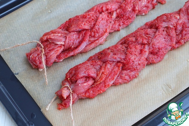 Сплести две косички. Косички накрыть пищевой пленкой и убрать на холод на ночь. Далее мясные косички полить растительным маслом и равномерно распределить масло по мясу. Мясные косички поместить в конвертики из фольги отправить в духовку для запекания.