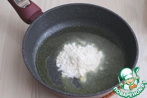 На сковороду добавить топленое сливочное масло (2 ст. ложки), добавить 1 ст. ложку муки с не большой горочкой. Пассеровать муку, помешивая, до кремового цвета.