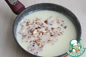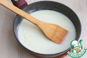 Далее сковороду с мукой снять с огня и добавить 200 мл. молока. Сковороду вернуть на средний огонь и постепенно добавить до 200 мл. воды. Проварить соус в течение нескольких минут до загустения, далее добавить по вкусу соль и белый молотый перец.
