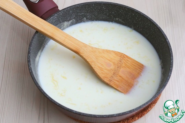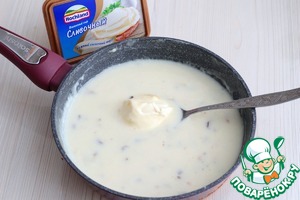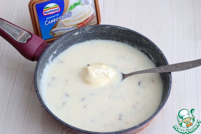 Далее соус снять с огня, добавить сливочный сыр ТМ "Hochland". Соус вернуть на тихий огонь и помешивая, расплавить сливочный сыр. Далее соус снять с огня.