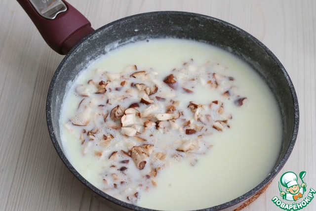 Грибы Шиитаке нашинковать кусочками и за 5-7 мин. до готовности, добавить в соус.