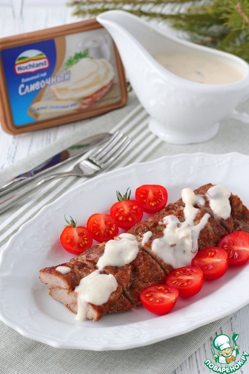 Нежное мясо с ароматом пряностей никого не оставит равнодушным. Порционная нарезка удобна для подачи, а сырный соус придаст дополнительную пикантность этому блюду.