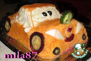 Салатик (но как то язык не поворачивется такой шедевр салатиком назвать) АВТОМОБИЛЬ вот вот унесет своих пасажиров в сказочную страну...
