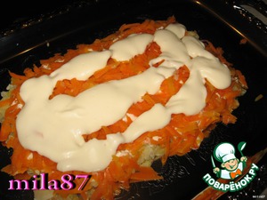 Покрываем слоем тертой моркови, покрываем майонезом.