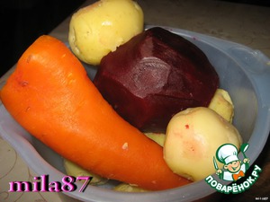 Не забываем отложить четыре кружочка от свеклы, одну морковь, пару больших картофелин и один лепесток лука.