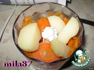 Измельчаем в блендере отложенную морковь и одну картофелину в пюре.