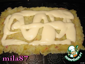 На поднос выкладываем прямоугольный слой картофеля, тщательно промазываем майонезом.