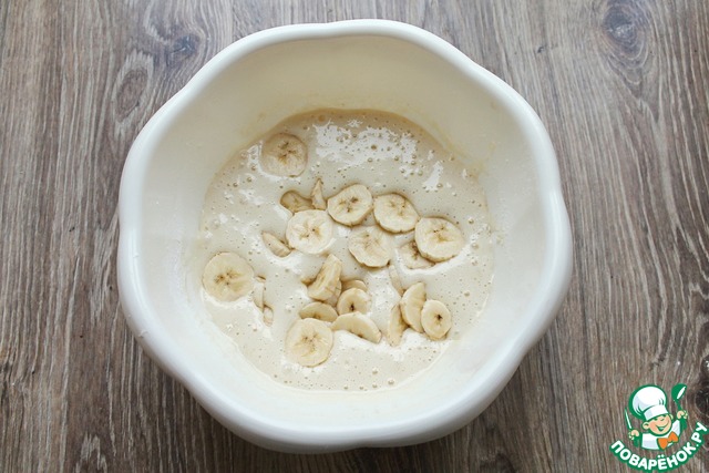 Банан почистите и порежьте на дольки. Положите их в тесто.