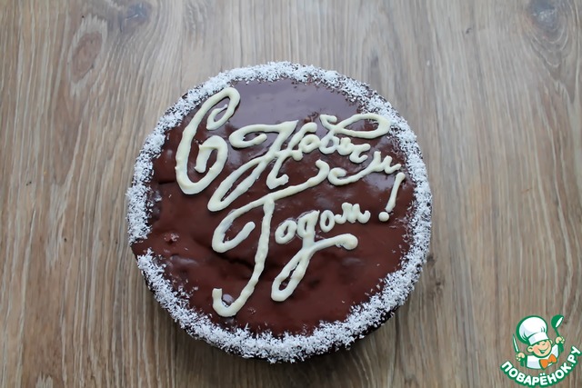 В кастрюлю налейте сливки и разогрейте, но не кипятите. Снимите с огня, положите поломанный шоколад, сливочное масло и перемешайте до однородности. Полейте верх пирога остывшей глазурью, так она станет гуще и не будет сильно стекать. Украшать можно после застывания глазури. Я, пока она еще не застыла, посыпала по краю кокосовой стружкой. А после того как она застыла, украсила надпесью из белого шоколада. Для нее я скачала трафарет, положила сверху пленку и на ней сделала надпись из растопленного шоколада. После застывания, аккуратно перенесла ее на пирог.