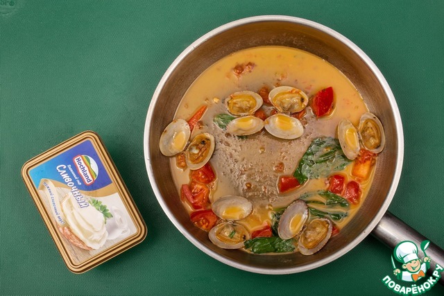 Ракушки вонголи варить в небольшом количестве воды в течение 3 минут. Затем добавить томаты, базилик, затянуть соус сливочным маслом.