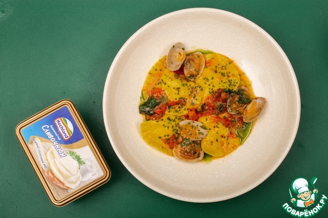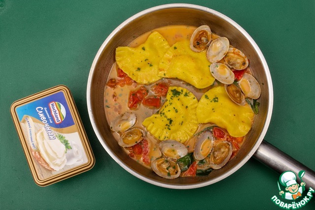 Равиоли – популярные итальянские макаронные изделия из теста со всевозможными начинками. Кстати, многие частенько сравнивают их с нашими пельменями и варениками, и определенное сходство между ними, конечно же, имеется. А главным отличием равиоли от иностранных собратьев является то, что у них всегда фигурные края, кроме того, они могут иметь самую разнообразную форму – эллипса, квадрата или даже полумесяца! И еще одна очень интересная особенность – равиоли не только отваривают, обжаривают или запекают, но еще и консервируют! Например, консервированные равиоли очень активно использовались во время Первой мировой войны солдатами итальянской армии! А в мирное время к праздничному столу можно подать чудесные равиоли с лососем, сливочным сыром Hochland и ракушками вонголе! Вонголе – это особая разновидность съедобных моллюсков, при этом, в отличие от устриц или мидий, которые могут быть выведены и в специально созданной для этих целей среде, вонголе можно выловить только в естественных условиях. Иногда вонголе именуют еще и морскими петушками, и нельзя не отметить, что они не только очень вкусны, но еще и чрезвычайно полезны! Так что смело сочетайте их с равиоли и сливочным сыром Hochland и удивляйте собравшихся за столом новыми необычными сочетаниями и вкусами!