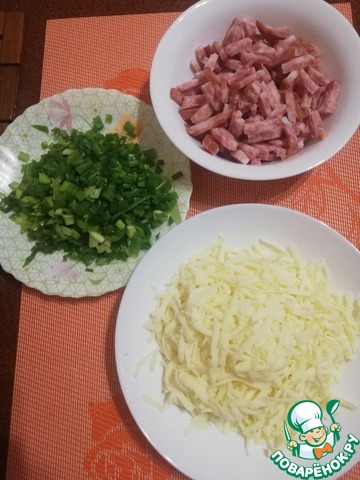 Тесто положить в полиэтиленовый пакет и оставить в холодильнике минут на 30 - 40. За это время можно приготовить начинку. Для начинки нарезать ветчину или колбасу соломкой, сыр натереть на крупной тёрке. Зелёный лук также нарезать. Вы можете использовать только сыр и зелёный лук. Лук является обязательным компонентом!