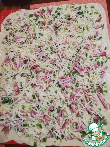 Тесто раскатать в тонкий пласт, смазать растопленным сливочным маслом кулинарной кисточкой. Посыпать зелёным луком, ветчиной и сыром.