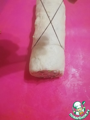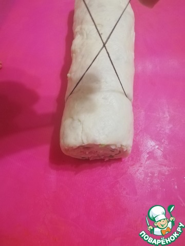И нарезать на шайбы размером 3-4см по толщине. Я использую для нарезки обычную нитку, на фото видно как. Плюшки получаются ровные и красивые.