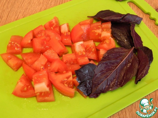 Порежем помидоры. Отделим листики базилика от веточки. Присолим слегка.