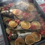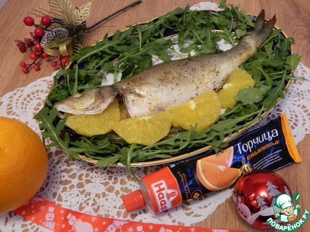 Очень вкусная пикантная рыбка. Мне попалась горчица ТМ "HAAS" с апельсинами, имеющая легий аромат апельсина и я решила приготовить рыбу запеченую в духовке и фаршированную апельсинами. Очень пикантный вкус приобрела рыбка. Угощайтесь.