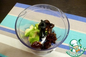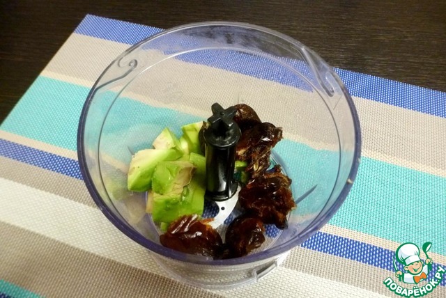 Из фиников вытащить косточки и измельчить вместе авокадо до состояния пюре.