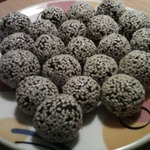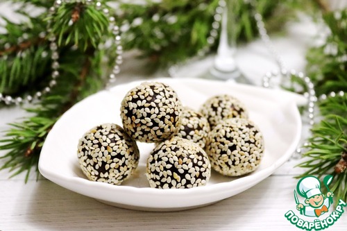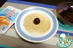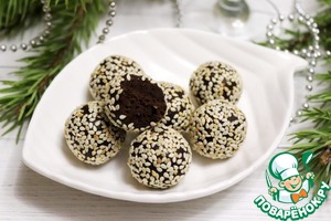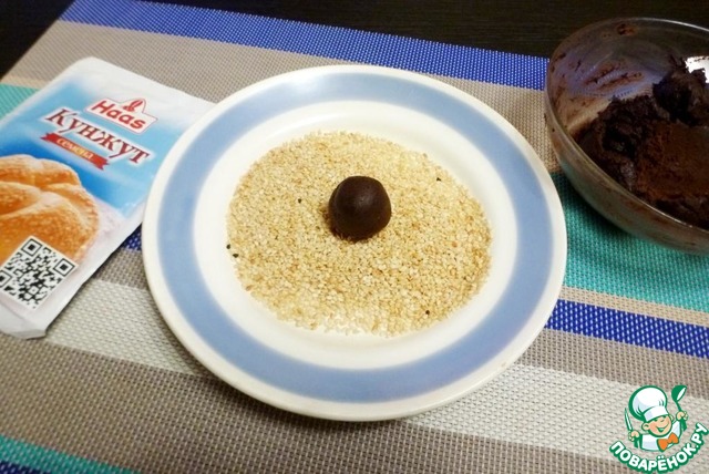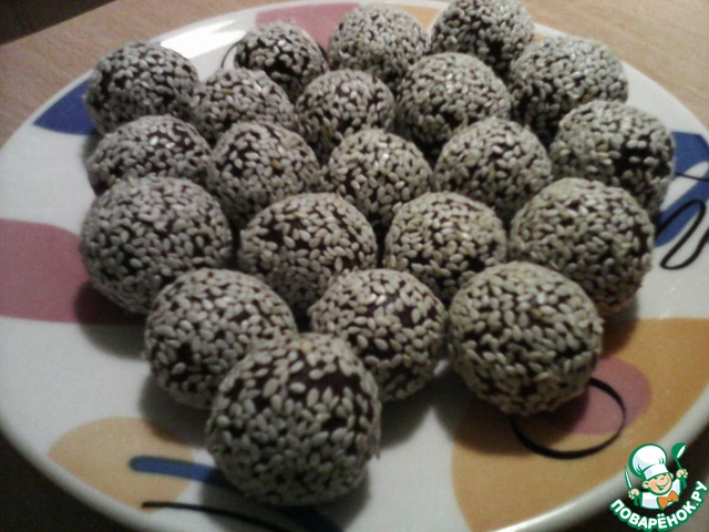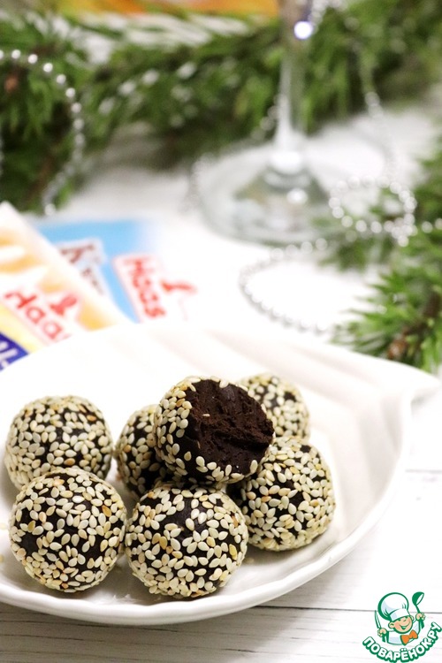Кунжут ТМ HAAS слегка поджарить на сковороде. Из шоколадной массы накатать шариков и обвалять в кунжуте. Чтобы конфеты были одинаковые, я их советую взвешивать. У меня получилось 14 конфет по 12-13 граммов.