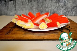 5. На ломтик сыра выкладывать яично-морковную массу и заворачивать в форме рулета