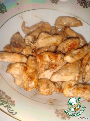 Замаринованное мясо быстро, на большом огне, буквально в 5 минут, обжариваем на сковороде до румяной корочки. Я жарила на кукурузном масле. Выкладываем в салатницу, я слила даже почти весь сок от зажарки в салатницу к мясу, она вкусная, вы как хотите.