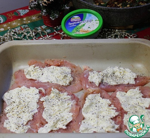 Куриное филе отбиваем. Курицу смазываем творожным сыром и посыпаем чёрным перцем.